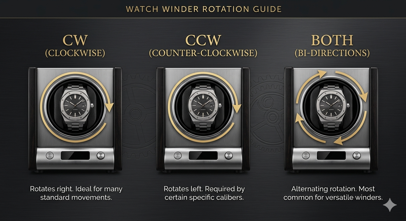 Patek Philippe & Valjoux 7750: Some movements only wind in one direction (typically Counter-Clockwise). If you set these to “Clockwise,” the rotor will spin freely without tensioning the spring—resulting in a dead watch. Always verify your caliber in our database.