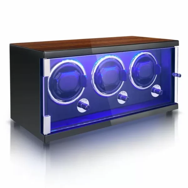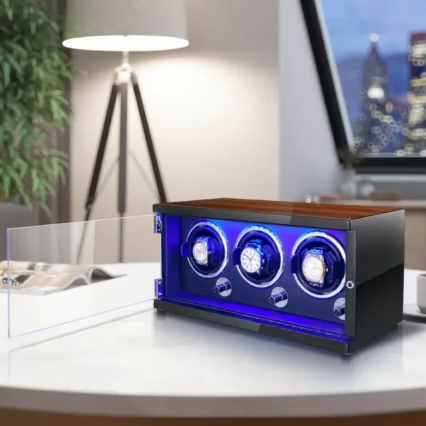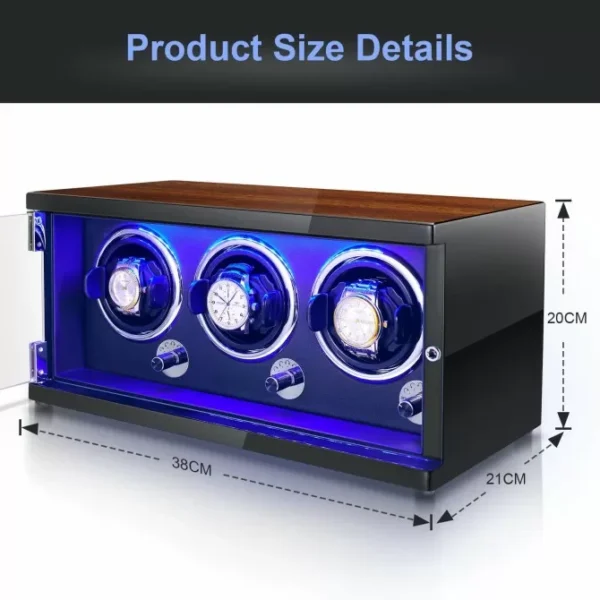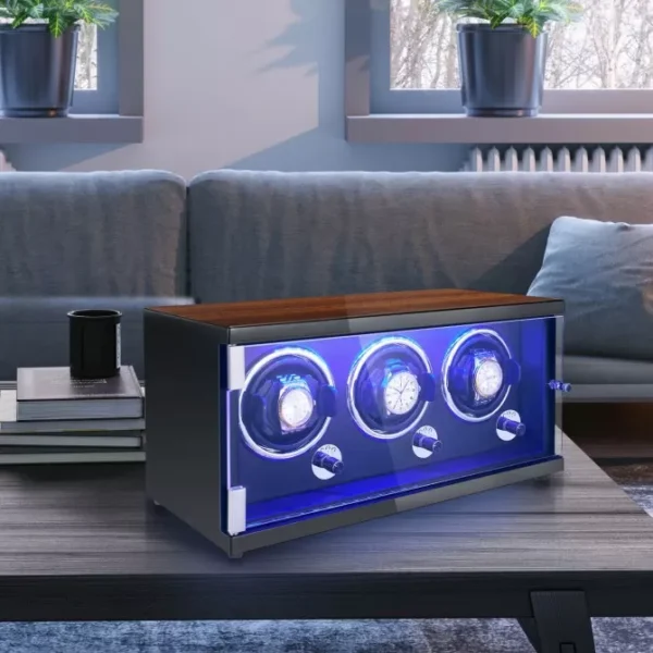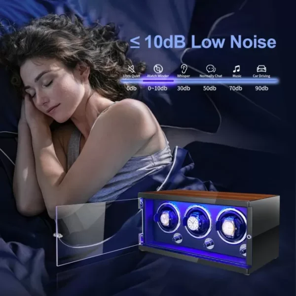 automatic watch winder is driven by a Japanese super silent motor, with noise as low as 5 dB to rotate your watches quietly and safely, with no running noise. The elegant LED light effect makes your watch impressive at any time