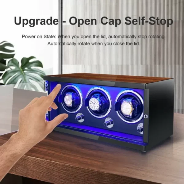 When you open the lid, it automatically stops rotating. Note: To turn on/off this function, you need to press the switch on the back for control. The innovative design makes it easier for you to pick and place the watch.
