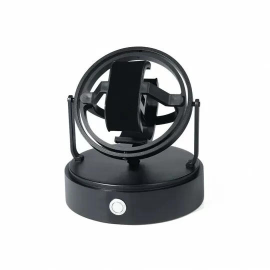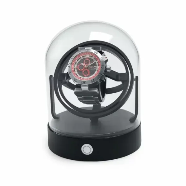 The Gyrowinder can rotate a watch in any direction, including a full 360° rollover. A Start-Stop button activates the mechanism with four sets of counterweights for individual weight adjustment for each watch. The Gyrowinder is protected by a hand-blown crystal glass cover and the base is made of solid aluminum with a black matte finish. The perfect way to display your treasured timepieces.