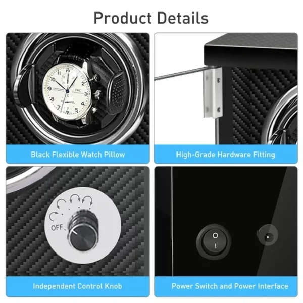 The watch winder is made of carbon fiber which is resistant to high temperature and corrosion, while the pillow is made of leather which is soft and can protect watch well.