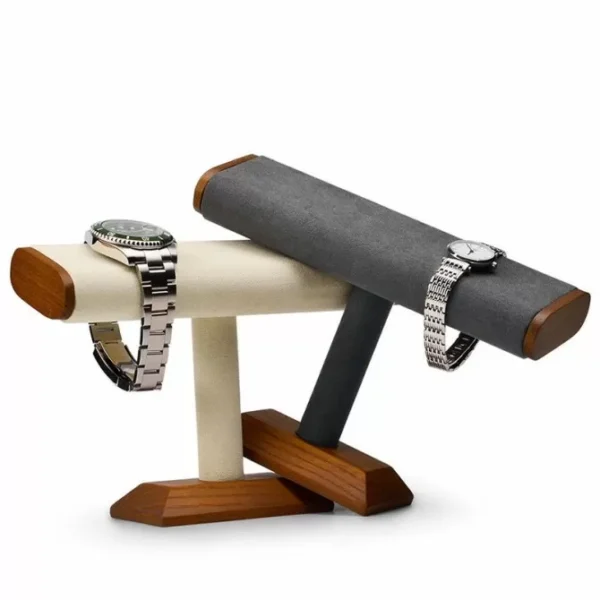 This is a watch stand made of solid wood and high-quality microfiber, which is of excellent quality and has a beautiful appearance. It is made with the highest quality materials and craftsmanship, and every little detail is carefully crafted.